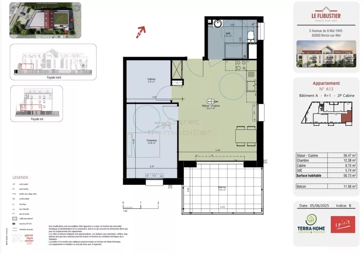 Appartement neuf à Berck sur mer, comprenant un séjour avec cuisine ouverte, une chambre, un coin cabine, une salle de douche, un toilette et un parking privatif.